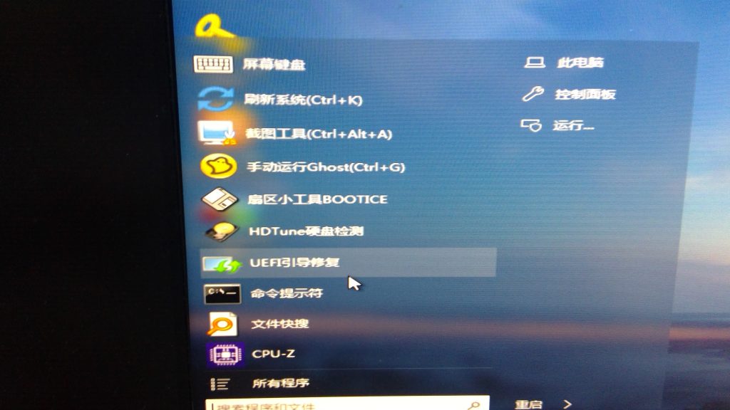 初步判断为引导文件挂掉,于是加载pe修复引导,用微pe自带的引导修复工具修复